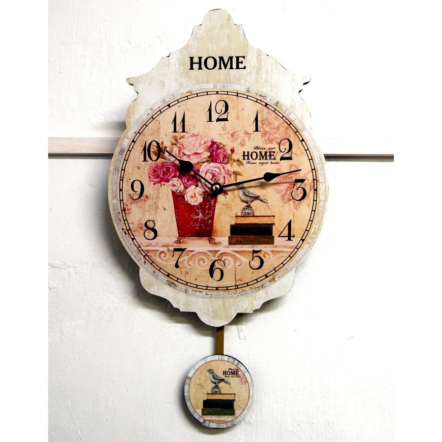 Zegar w stylu prowansalskim z wahadłem, na którym widnieje romantyczny, prowansalski obrazek: po lewej stronie znajdują się róże w czerwonym wazonie, a po prawej ptaszek siedzący na trzech książkach. W górnej części zegara znajduje się napis HOME.