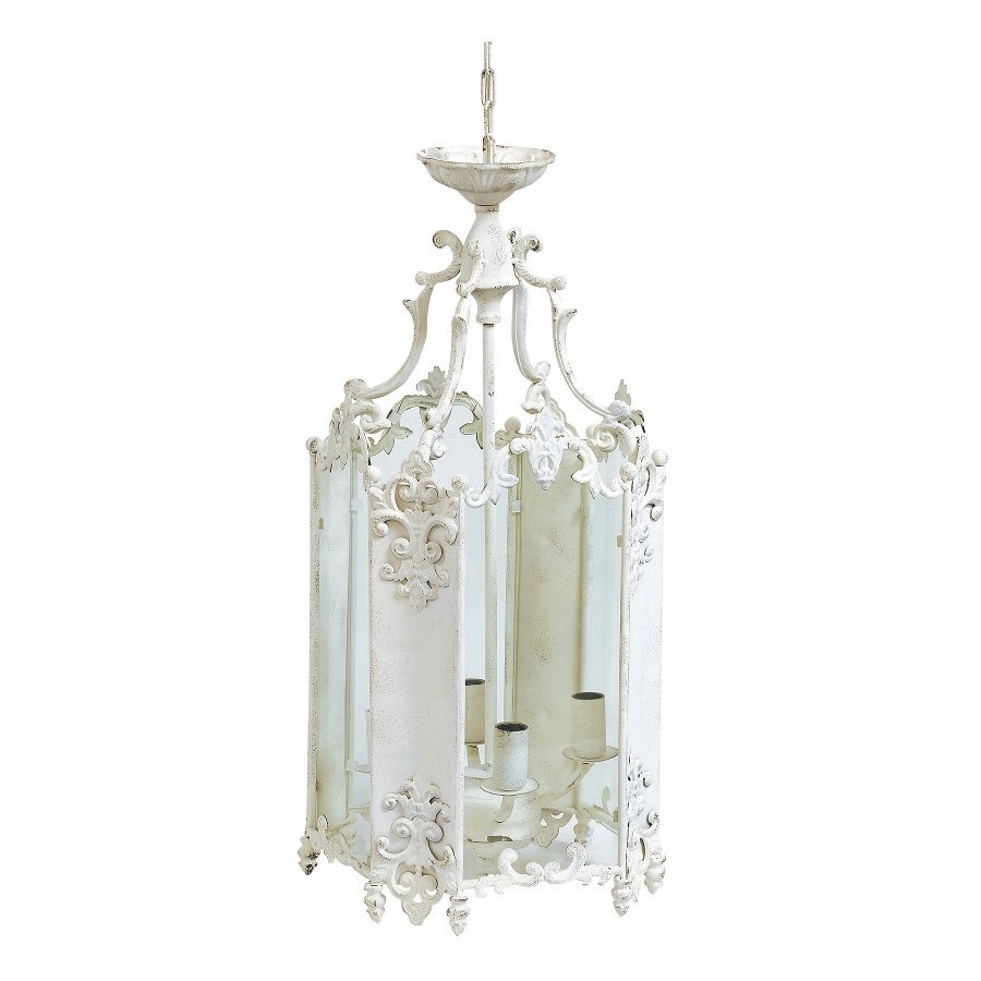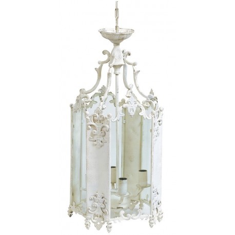 Wenecja Lampa Sufitowa Klatka to biała lampa prowansalska marki Belldeco. Biała obudowa oraz kwiatowe wzory znajdujące się w górnej i dolnej części lampy wykonane są z metalu, a przezroczyste ścianki lampy Wenecja wykonane są ze szkła. Na powierzchni lampy sufitowej Wenecja znajdują sie czarne oraz ciemnoszare przecierki nadające lampie stylowy efekt postarzenia. Lampy są przystosowane do czterech żarówek o mocy 25W każda.