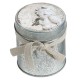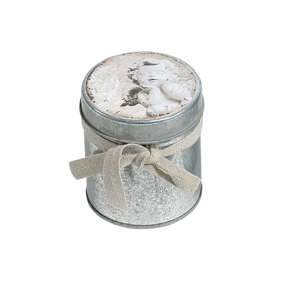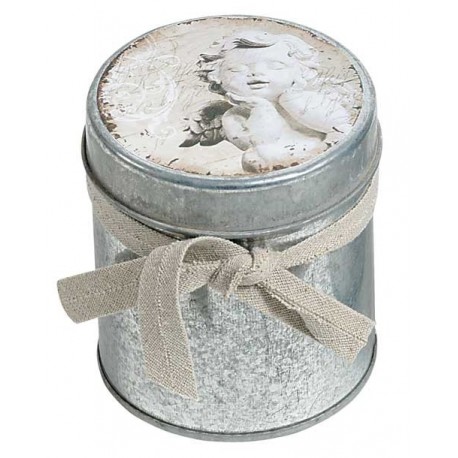 Uroczy Romantic Pojemnik Belldeco w stylu prowansalskim, wykonany z ocynku. Wieczko metalowego pudełka Romantic ozdobione jest nadrukiem z zamyślonym aniołkiem, naklejonym na pojemnik techniką decoupage. Dodatkowego uroku dodaje pojemnikowi Romantic materiałowa wstążka.