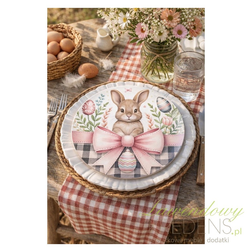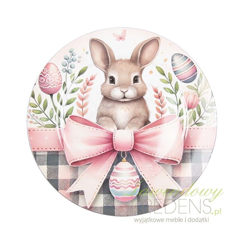 Jeśli irytują Cię ślady po talerzach, okruszki na bieżniku i chaos na stole podczas śniadania wielkanocnego, ten podtalerz wielkanocny Clayre & Eef rozwiązuje problem jednym detalem. Szeroka, dekoracyjna powierzchnia wyznacza miejsce nakrycia, stabilizuje talerz i tworzy czytelną kompozycję – nawet gdy serwujesz kilka dań i półmiski krążą po stole. Polecam go szczególnie do jasnych obrusów: działa jak elegancka „tarcza” ochronna, a jednocześnie nie przytłacza aranżacji.Dekoracja stołu: zajączek, pisanki i pastelowa wstążka w stylu cottage