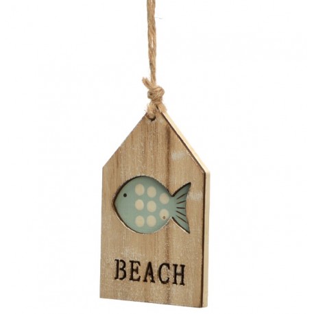 Zawieszka ozdobna wykonana została w stylu marynistycznym i ma kształt domku. Drewniana zawieszkama piękną rybkę w kolorze morskim oraz napis BEACH. Zawieszka ze sznurkiem, którą moża przyczepić do kluczy, torebki, okna czy w innym dowolnym miejscu. Styl marynistyczny coraz częściej gości w naszych pomieszczeniach jak i w dodatkach. My polecamy zawieszki z wybranym motywem marynistycznym!