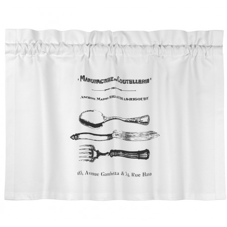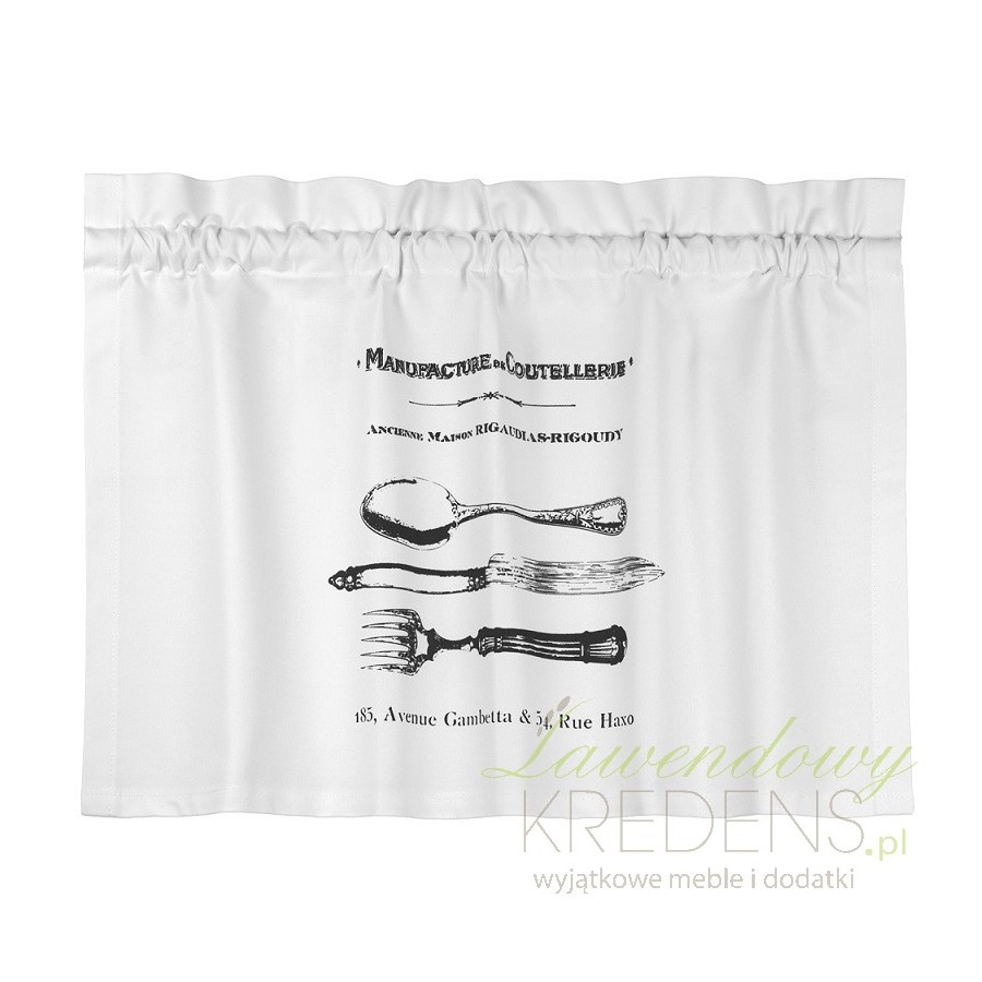 Prezentujemy białe zazdrostki do kuchni, które urzekają czarnymi nadrukami przedstawiającymi komplet sztućców: łyżkę, nóż i widelec na tle napisów w języku francuskim. Niesamowicie odmienić mogą Twoją kuchnię, tworząc spokojny, domowy klimat, dodatkowo zapewniając poczucie bezpieczeństwa i prywatności!