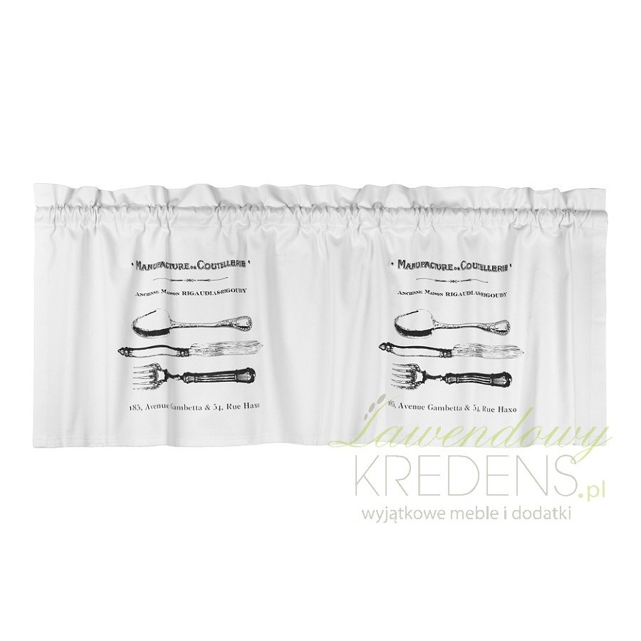 Białe, duże zazdrostki do kuchni prezentowane przez firmę French Home z grafika dekoracyjnych sztućców! Polecamy!