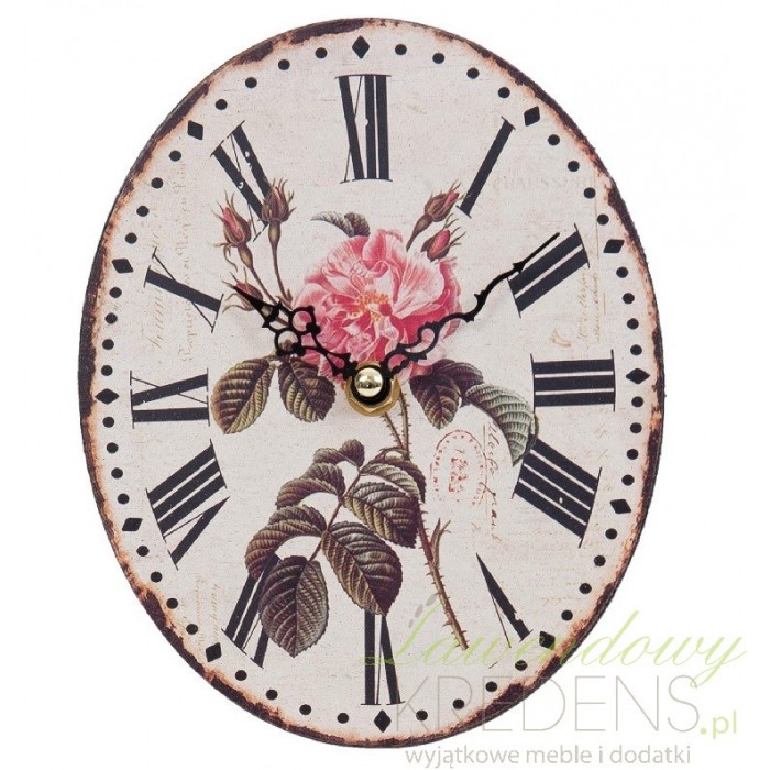 Interesuje Cię jak dodać wartości swojemu wnętrzu? Najlepszym sposobem jest wykorzystanie odpowiednich mebli i dekoracji, które znajdziesz w naszej ofercie. Zegar z różą, który polecamy do kuchni salonu wykonany został z drewna i przedstawia piękną różę na jasnym tle. O wiekowości zegara świadczą roztaczające się wokół tarczy ciemne ślady rdzy. Niebanalne zegary ścienne takie jak zegar owalny zdobiony kwiatem róży doda wnętrzu romantyzmu.