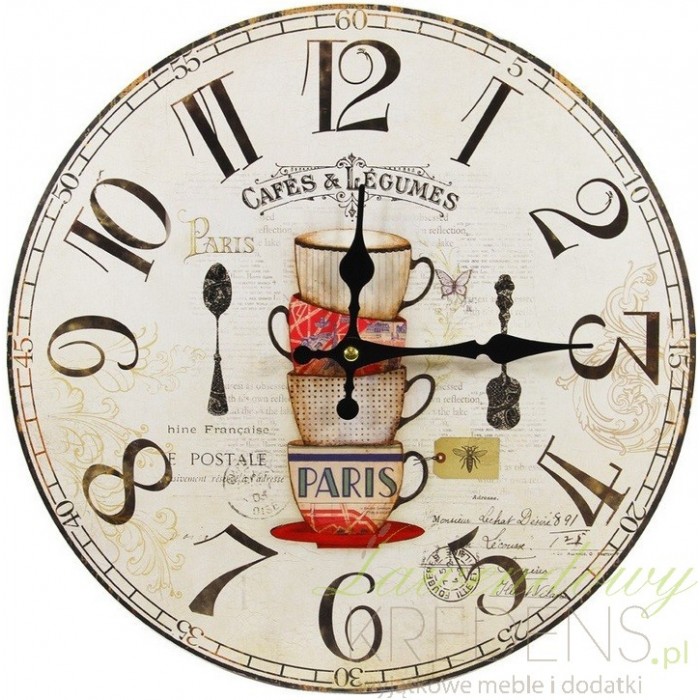 Zegar do kuchni ma jasny kolor, duże i czarne cyfry oraz nadruk z kolorowymi filiżankami ułożonymi jedna w drugiej. Oprócz filiżanek na zegarze dostrzec można napisy oraz starodawne łyżeczki. Ciemna obwoluta zegara wskazuje na antyczną inspiracje. Zegary ścienne takie jak zegary kuchenne, dzięki motywom zaczerpniętym z kuchennych aranżacji będą pasowały tam idealnie!