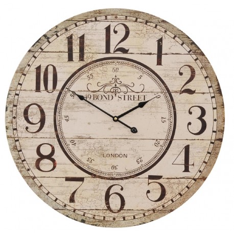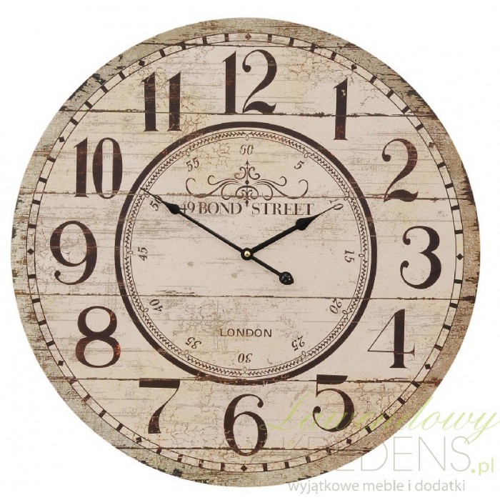Zegary ścienne od Clayre&Eef to ozdoby przypominające prawdziwe dzieła sztuki. Zegar Vintage wygląda jak drewniany dzięki licznym słojom i jasnobrazowej kolorystyce. Naniesiono na niego dobrze widoczne, ciemnobrązowe cyfry arabskie, a po środku zamontowano dwie wskazówki. Zegar Vintage z napisem "49 Bond Street" sprawi, że we wnętrzu zapanuje prawdziwy, angielski klimat.
