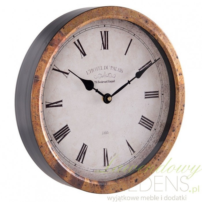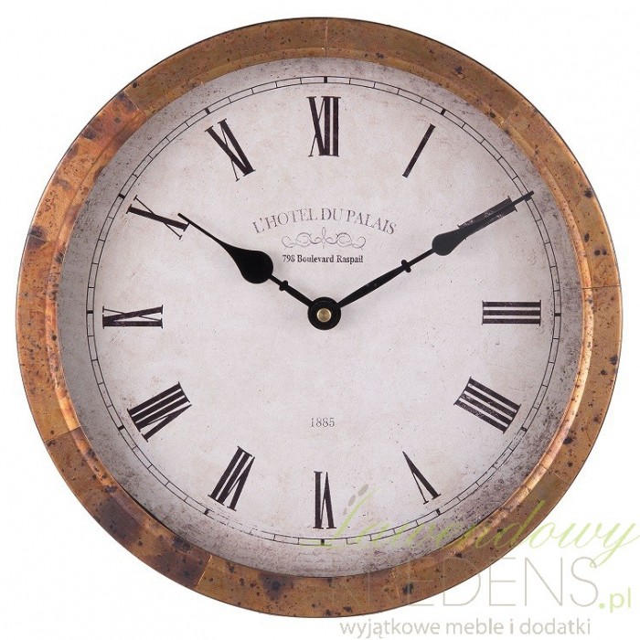 Zegar prowansalski wykonany jest z wysokiej jakości metalu i szkła. Ma okrągły kształt i postarzaną, nakrapianą ramę. Rama ma kontrastujący miedziany kolor i czarne rzymskie cyfry na tarczy. Zegary ścienne to doskonała alternatywa dla zegarów stojących.