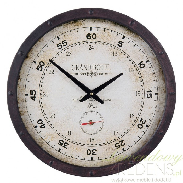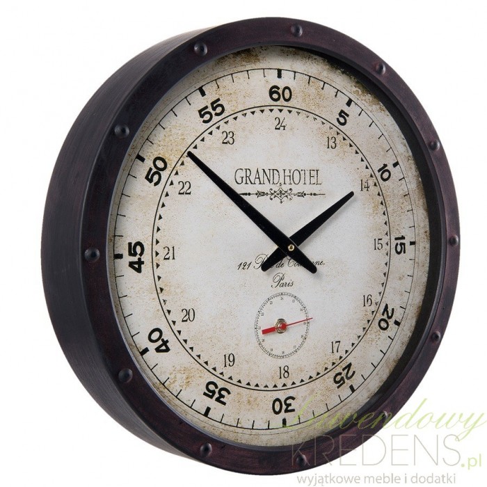 Efektownie prezentujący się duży zegar retro z czarnym napisem Grand Hotel, dzięki postarzeniom doskonale wykreuje niepowtarzalną i piękną przestrzeń.