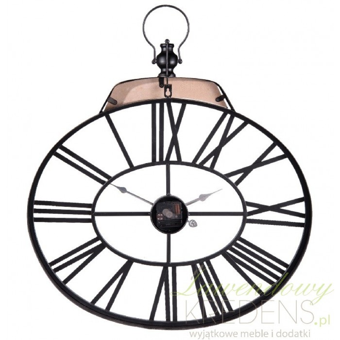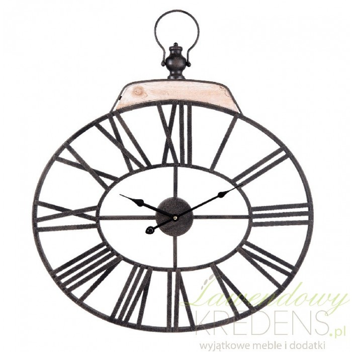 Czarny zegar postarzany ma kształt owalu z charakterystycznym dla loftowego stylu uchwytem ozdobnym na górze.