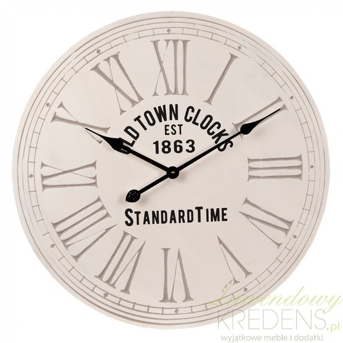 Beżowy zegar retro z kolekcji Old Town ma wyżłobione, duże i ciemne cyfry rzymskie oraz ozdobne napisy angielskie.