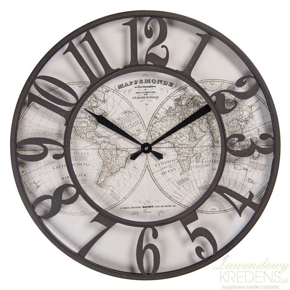 Okrągły zegar z mapą wyróżnia się niezwykle ciekawą konstrukcją. Stanowi połączenie metalowego pierścienia z arabskimi cyframi, który zamocowany został na cyferblacie. Na tarczy nadrukowana jest postarzana mapa świata. Zegary z mapami to zegary ścienne, które pokochasz od pierwszego spojrzenia!