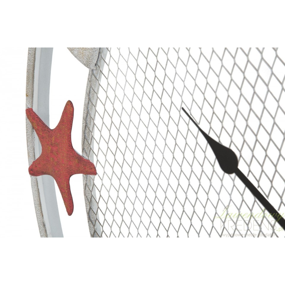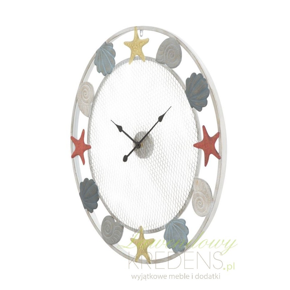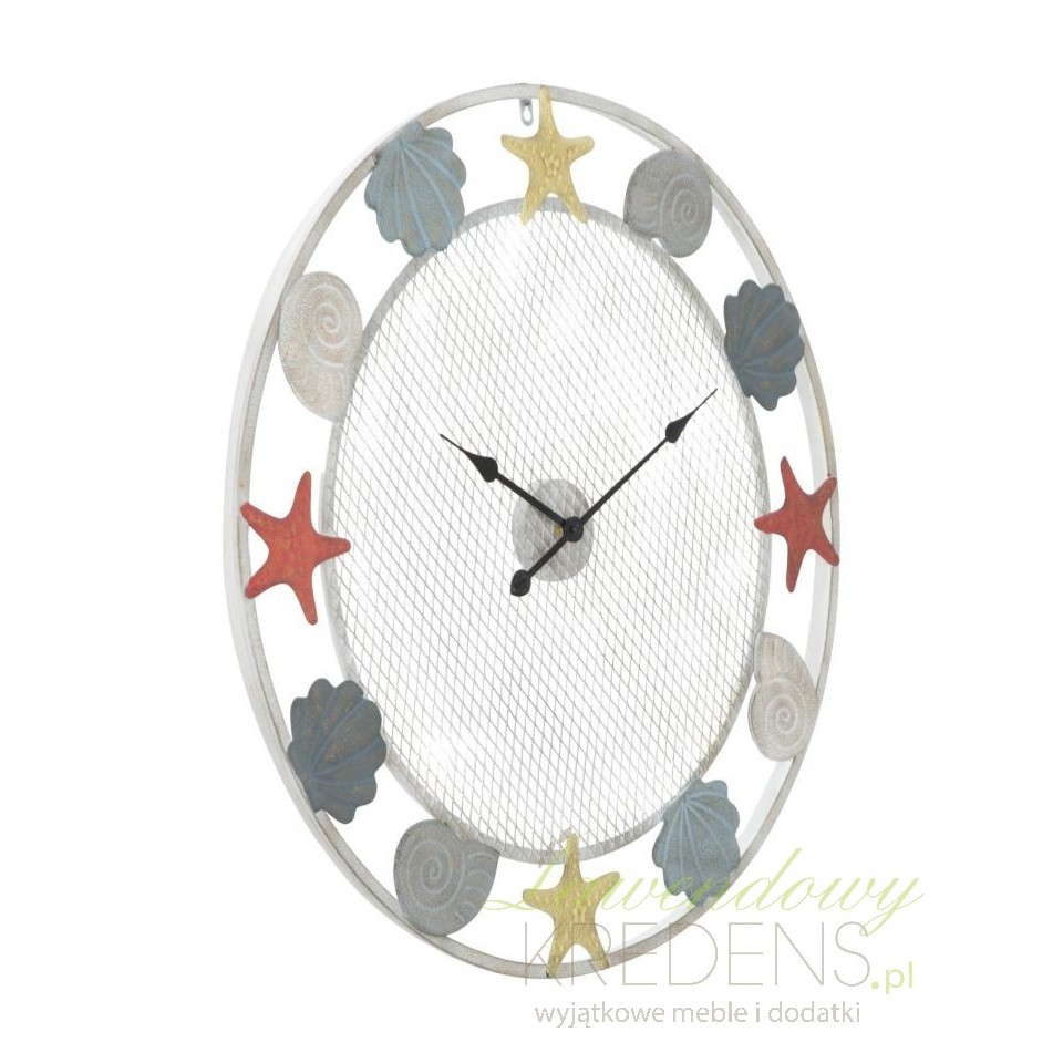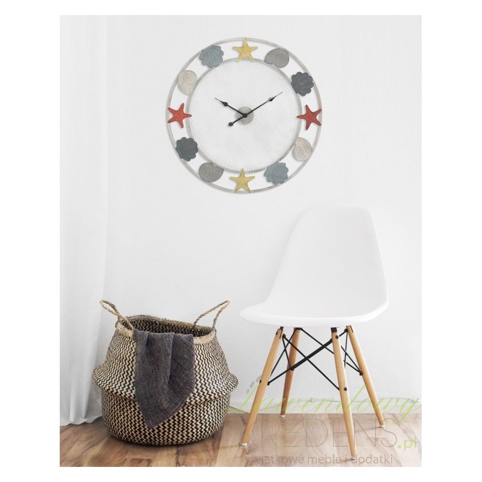 Zegar w stylu marynistycznym z dużym, okrągłym cyferblatem wykonanym z metalowej siatki. Wykorzystane do oznaczenia godzin, kolorowe muszle i rozgwiazdy poświadczają niepowtarzalny design produktu. Duży zegar inspirowany morskimi przygodami ma średnicę sięgającą prawie jednego metra! Zegary w stylu marynistycznym od Mauro Ferretti to hit w naszej ofercie!