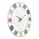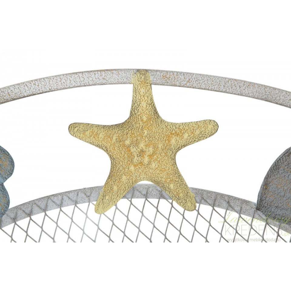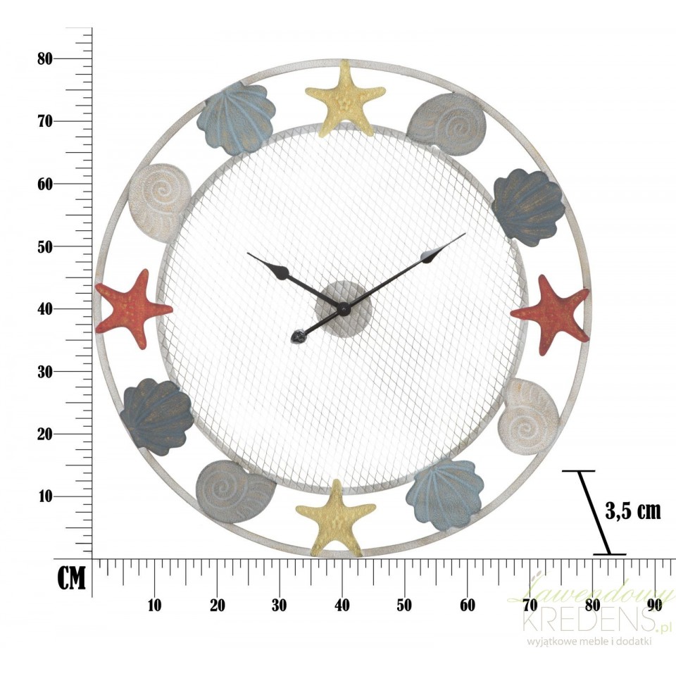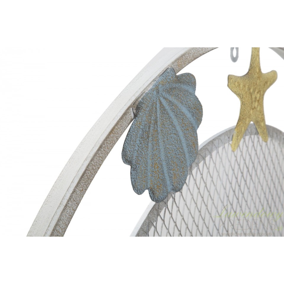 Zegar w stylu marynistycznym z dużym, okrągłym cyferblatem wykonanym z metalowej siatki. Wykorzystane do oznaczenia godzin, kolorowe muszle i rozgwiazdy poświadczają niepowtarzalny design produktu. Duży zegar inspirowany morskimi przygodami ma średnicę sięgającą prawie jednego metra! Zegary w stylu marynistycznym od Mauro Ferretti to hit w naszej ofercie!