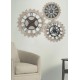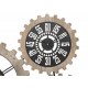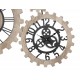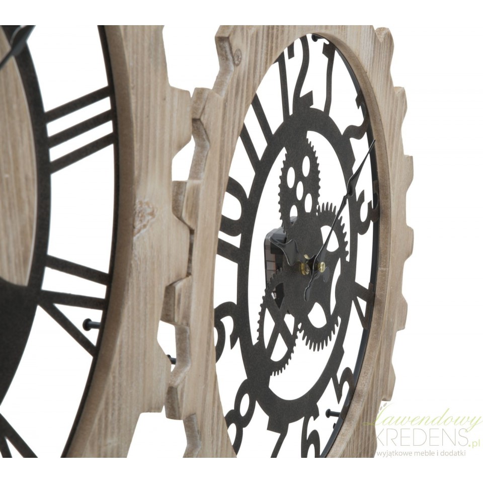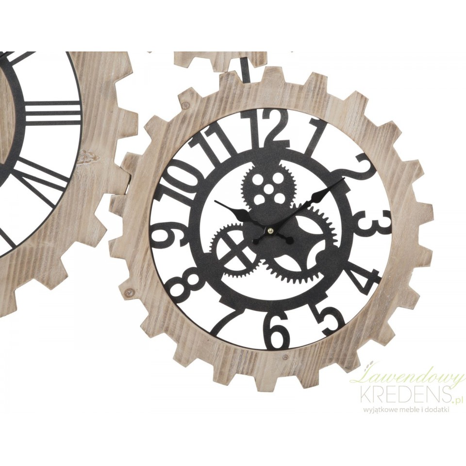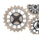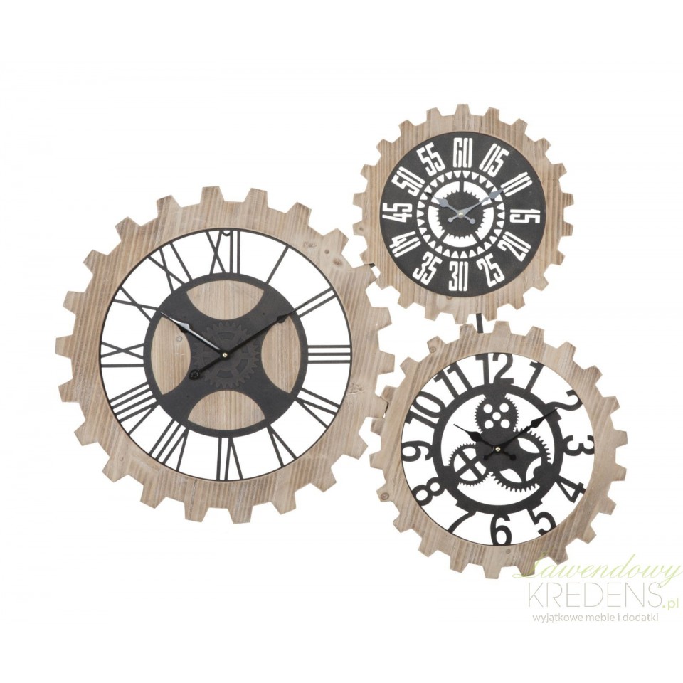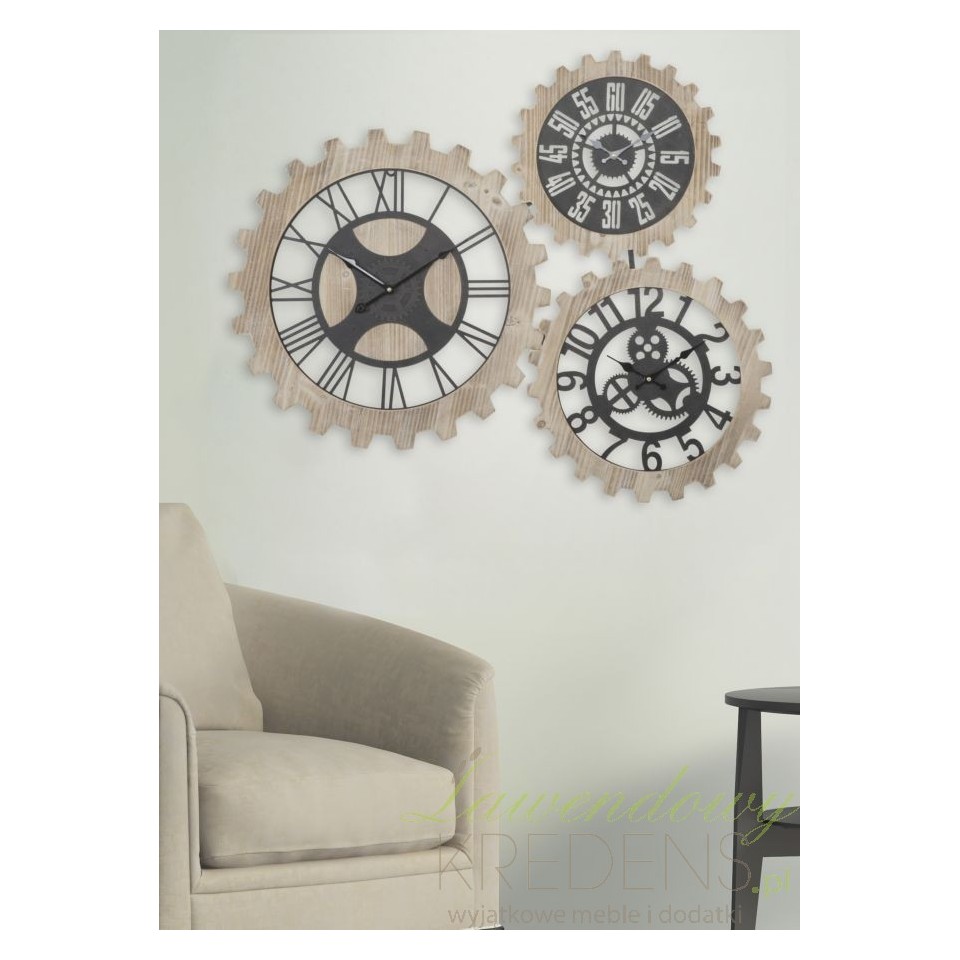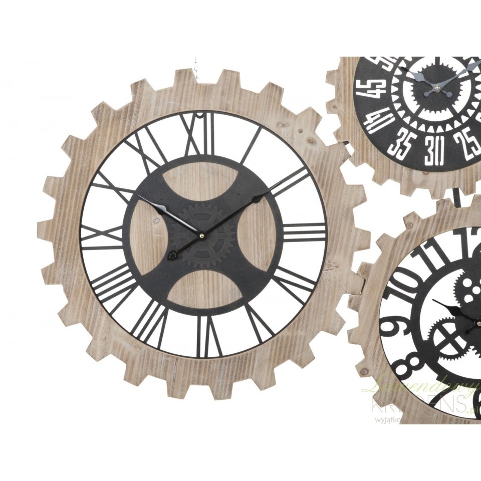 Potrójny zegar w stylu industrialnym na pierwszy rzut oka wygląda jak mechanizm napędzający ogromną maszynę, a to dlatego, że każdy z trzech zegarów kształtem przypomina koło zębate.