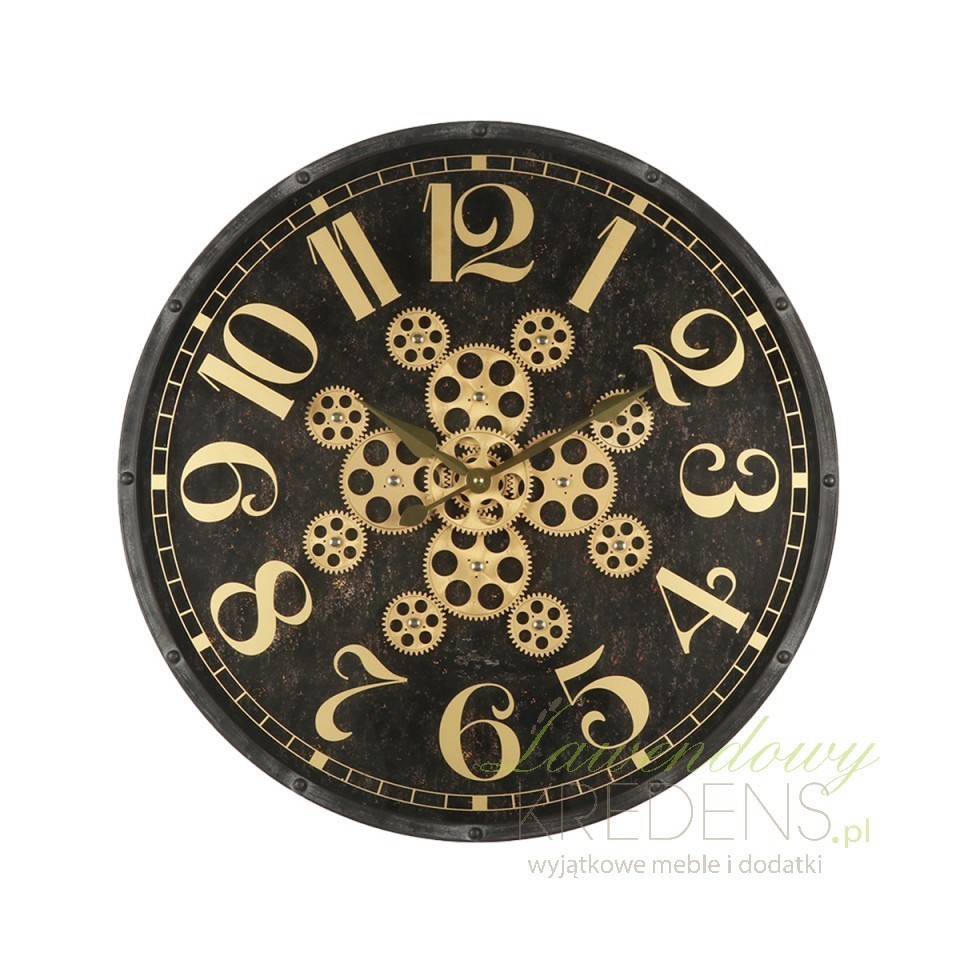 Zegar industrialny z ozdobnym mechanizmem w formie miedzianych kół zębatych na czarnym cyferblacie to model, który zwróci na siebie uwagę każdego!