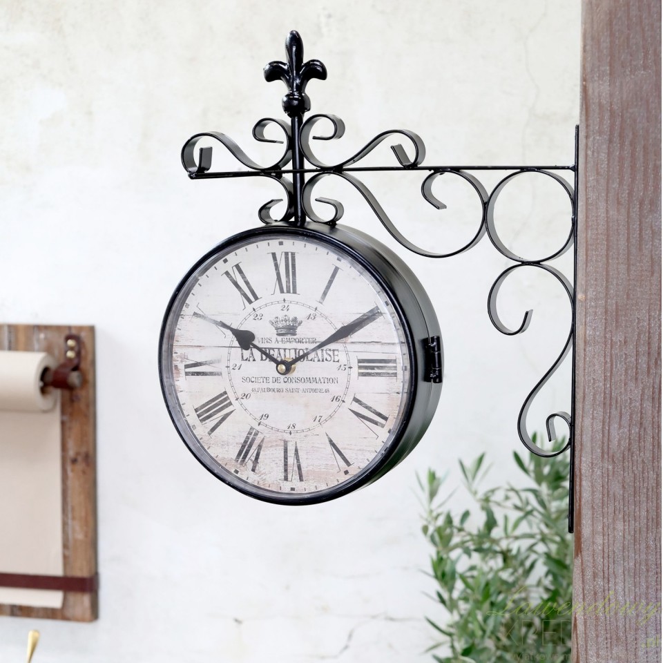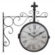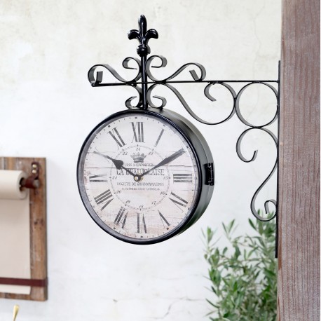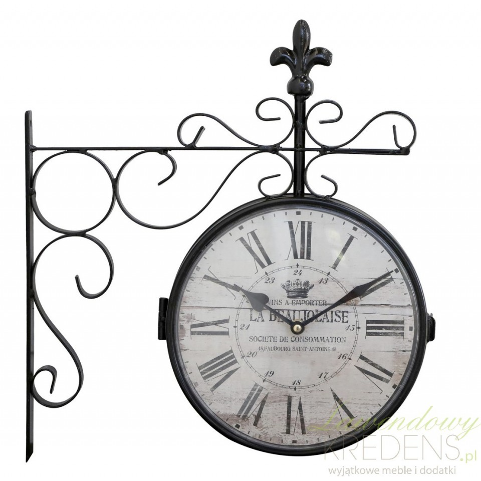 Zegar dworcowy dwustronny Chic Antique to stylowy dodatek, który łączy praktyczność z dekoracyjnym urokiem. Jego solidna metalowa konstrukcja w czarnym kolorze doskonale wpisuje się w estetykę retro, a francuskie napisy na postarzałych tarczach nadają mu wyjątkowy charakter. Dzięki dwustronnemu designowi zegar pozwala na odczytanie godziny z dwóch stron, co sprawia, że jest nie tylko pięknym, ale i funkcjonalnym elementem wyposażenia wnętrza. Wymiary 36 cm szerokości i 41 cm wysokości czynią go wyrazistym akcentem, który łatwo zauważyć, ale nie przytłacza przestrzeni.