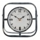Zegar stojący w stylu industrialnym składa się z kwadratowego okienka z metalu i okrągłego cyferblatu zamontowanego pośrodku otwartego stelaża.