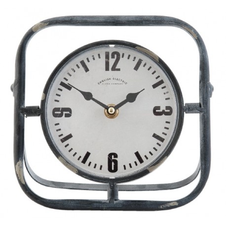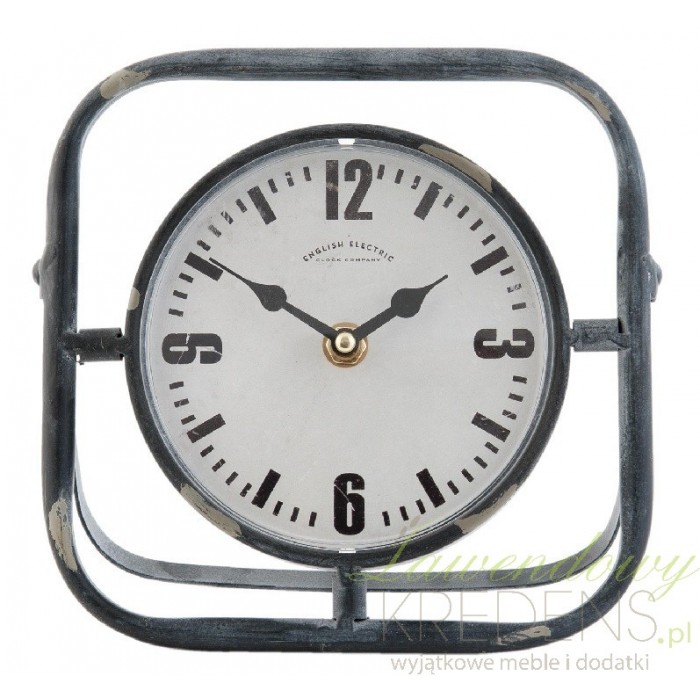 Stojący zegarek loft ma bardzo prostą budowę, ponieważ składa się na nią jedynie kwadratowa, otwarta ramka i okrągły cyferblat. Metalowe elementy mają szary kolor i kilka postarzeń wprowadzających nutę antycznego designu. Czarne cyfry i kreski oznaczające minuty na białej tarczy ułatwią precyzyjne odczytanie godziny. Wybierz zegary loft takie jak zegarek stojący i wykorzystaj w miejscach takich jak biurka, regały i komody.