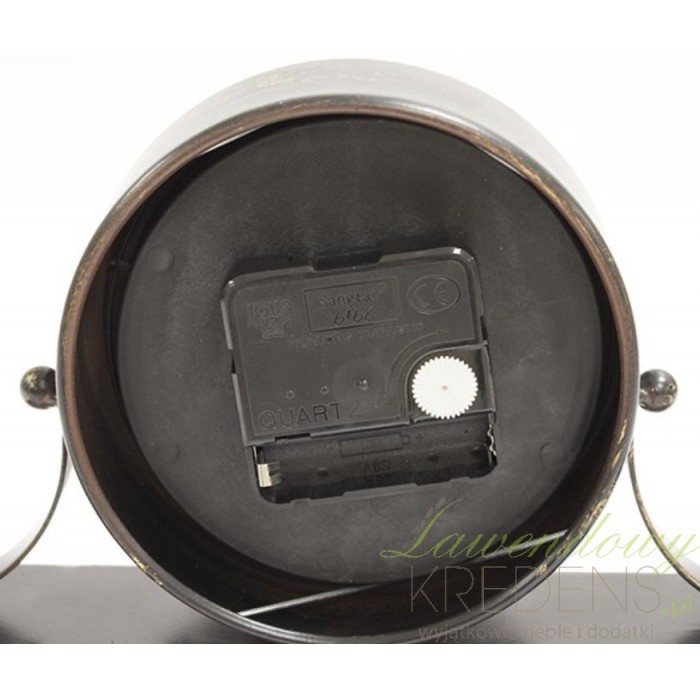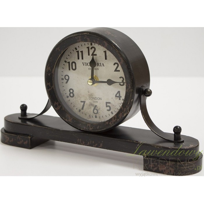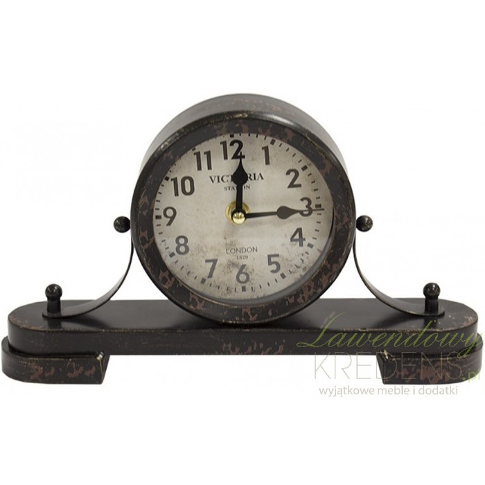 Zegar stołowy w stylu Vintage wykonano z metalu i szkła. Cały w kolorze czarnym doskonale komponuje się z postarzaną tarczą i jaśniejszymi odpryskami. Stojący zegar składa się z dwóch części: okrągłego cyferblatu oraz owalnej, płaskiej podstawy. Okrągła tarcza zamocowana pośrodku za pomocą dwóch metalowych wsporników jest chroniona szklaną taflą szkła.