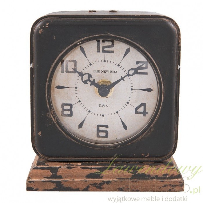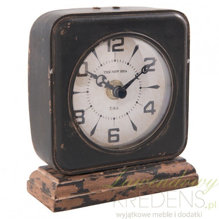 Kwadratowy zegar stołowy jest wykonany z metalu, ma czarny kolor i brązowe odpryski na podstawie.