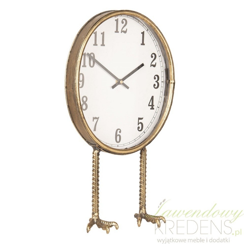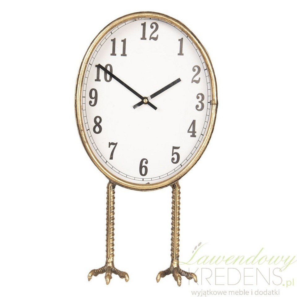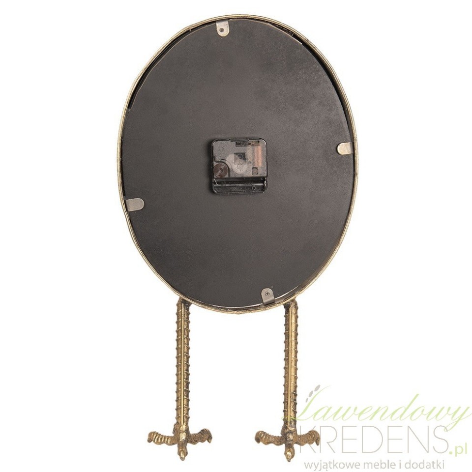 Owalny, wskazówkowy zegarek stołowy ze zwierzęcym motywem to stylowy i praktyczny dodatek do domu. Jesteśmy pewni, że znajdzie zastosowanie w wielu pomieszczeniach i aranżacjach, a w szczególności w rustykalnych i prowansalskich kuchniach i salonach. Zegar wykonany został z metalu w kolorze złota, a jego podstawę stanowią kurze, charakterystycznie marszczone łapki. Dodatki do domu w złotym kolorze od Clayre&Eef nie umkną wzrokowi żadnego gościa!