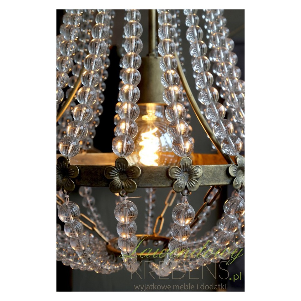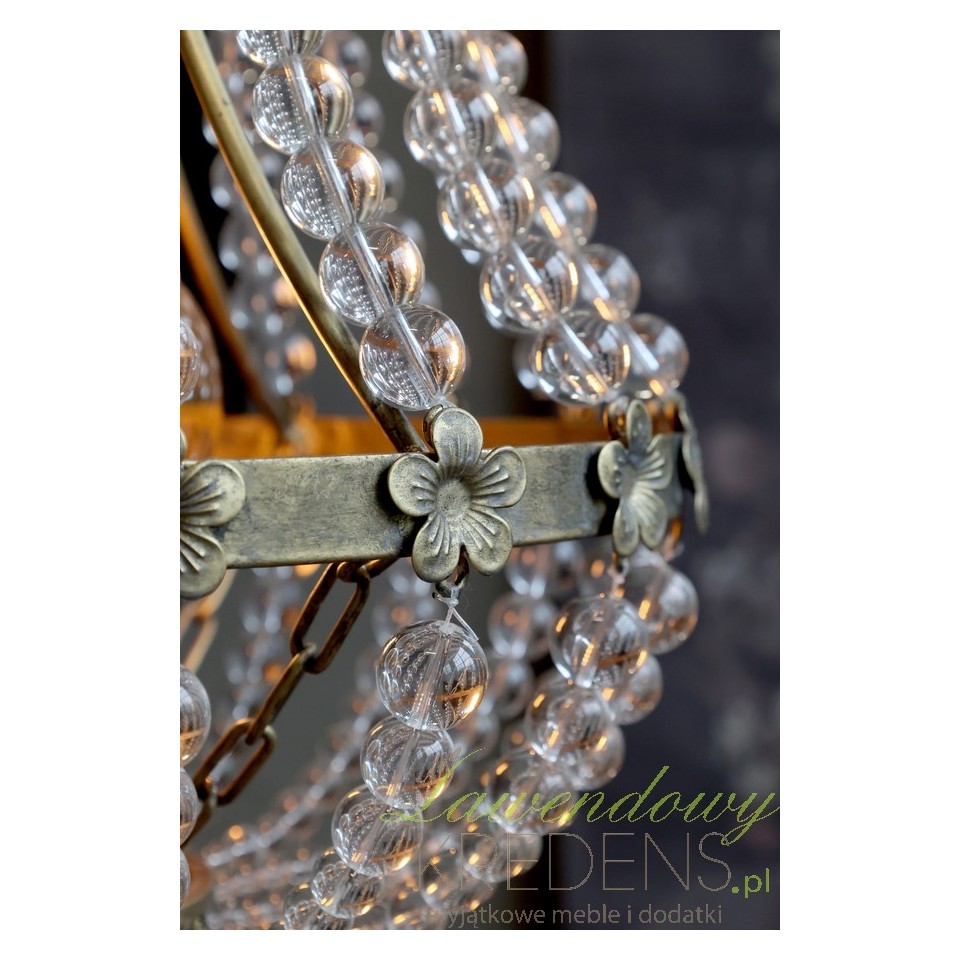 Dekoracyjny charakter lampy podkreśla starannie wykonany, florystyczny wzór u podstawy. Złotawy odcień mosiądzu kontrastuje z przejrzystością kryształków, tworząc harmonijne zestawienie, które świetnie dopełni wnętrza urządzone w naturalnych tonach, z elementami drewna, ceramiki czy plecionek. Jednocześnie żyrandol jest na tyle subtelny, że nie przytłacza przestrzeni – raczej ją ubiera i ociepla.